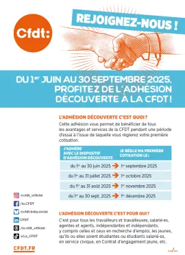 Du 1er juin au 30 septembre, c'est le retour de l'adhésion découverte de la CFDT : jusqu'à 3 mois pour découvrir la majorité des avantage et services de la CFDT avant de payer votre première cotisation.
